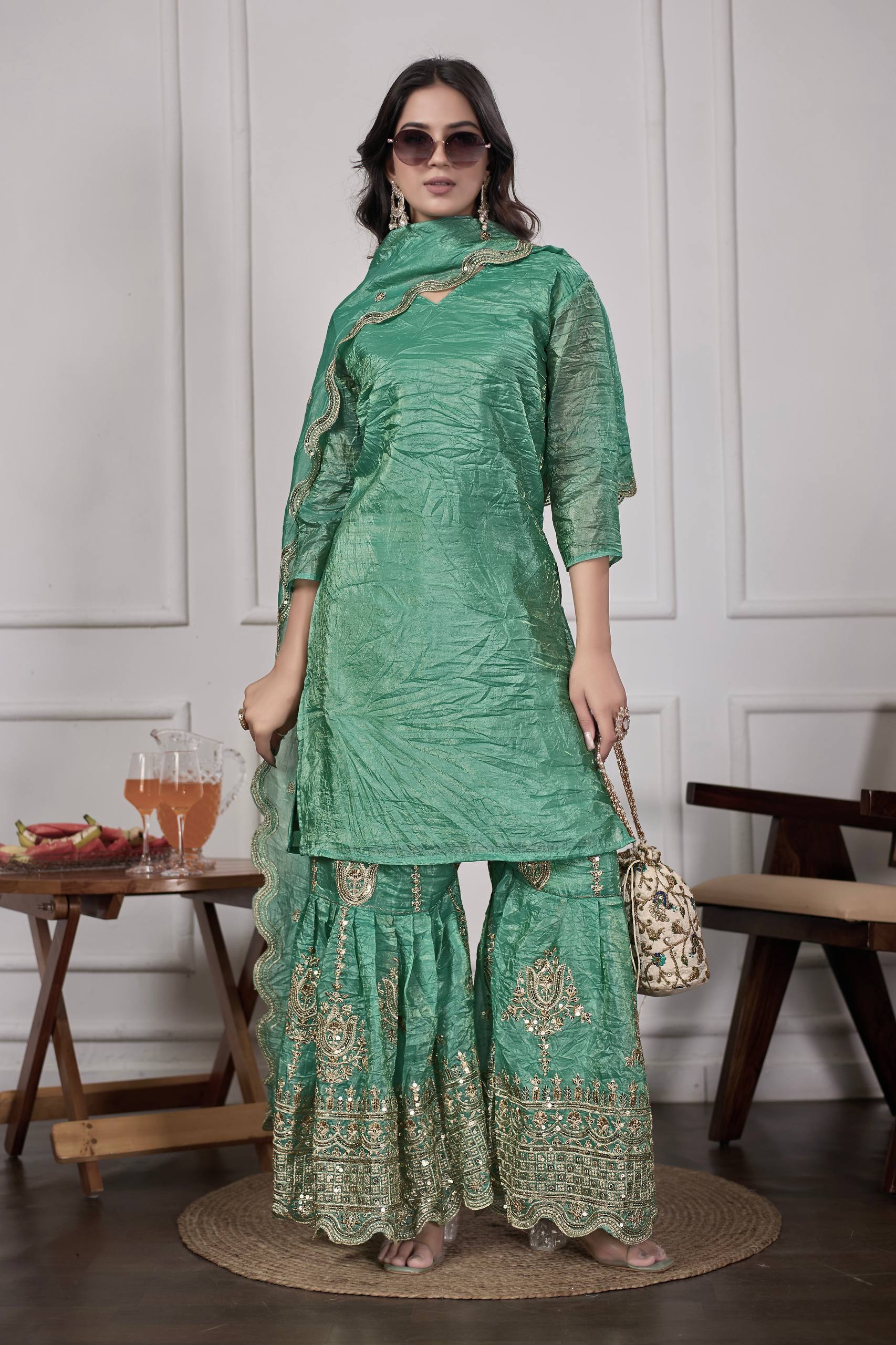 Festive Green Silk Sharara Suit with Dupatta