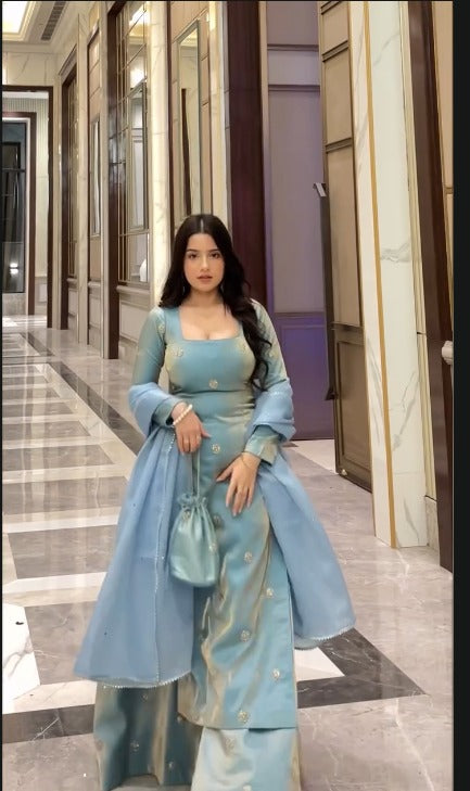Work : Golden Embroidered Motifs All Over & Lace on Border