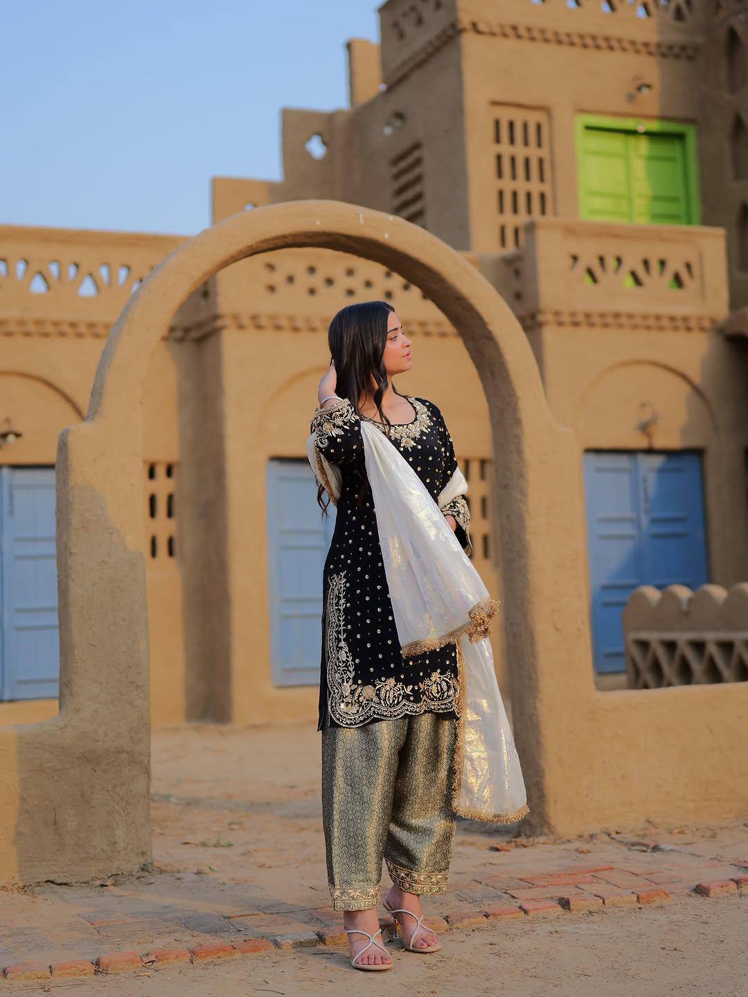 Work: Beautiful 5mm sequins & zari embroidery work with cutwork border
