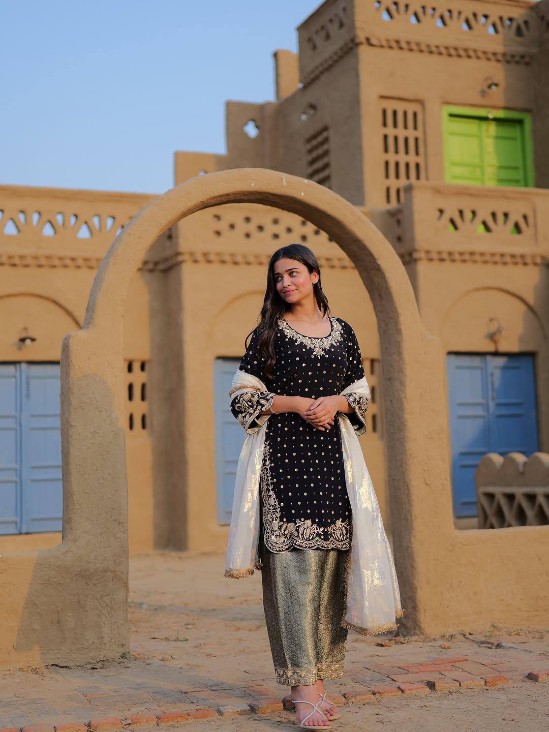 Work: Beautiful 5mm sequins, thread & zari embroidery work on border with cutwork